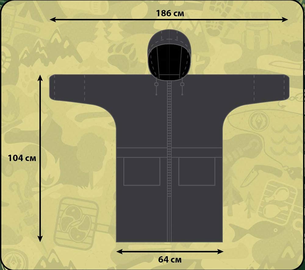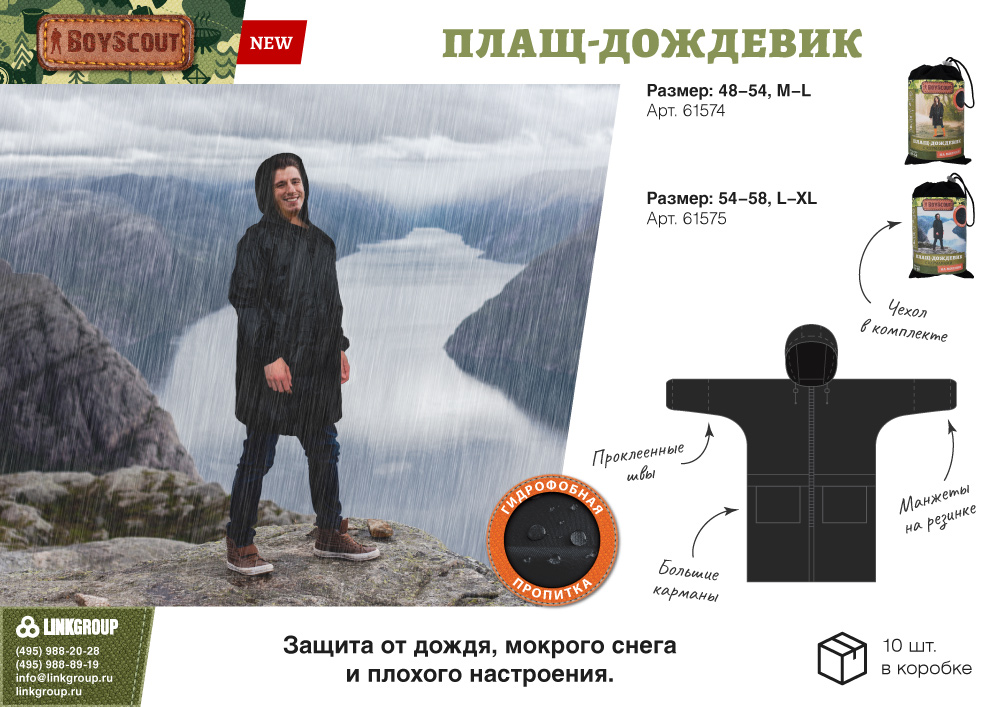 Размер 48-54. Длина по рукавам 186 см, без рукавов - 64 см, высота 104 см На улице дождь или мокрый снег? Вы всегда будете чувствовать себя комфортно с дождевиками BoyScout. В походе, на охоте и на рыбалке Вы получите максимум удовольствия, не взирая на капризы погоды. Надежные и легкие универсальные дождевики BoyScout легко упаковываются в специальные мешочки для транспортировки и не займут много места в рюкзаке. Особо порадуют проклеенные швы, способные устоять перед серьезным ливнем.