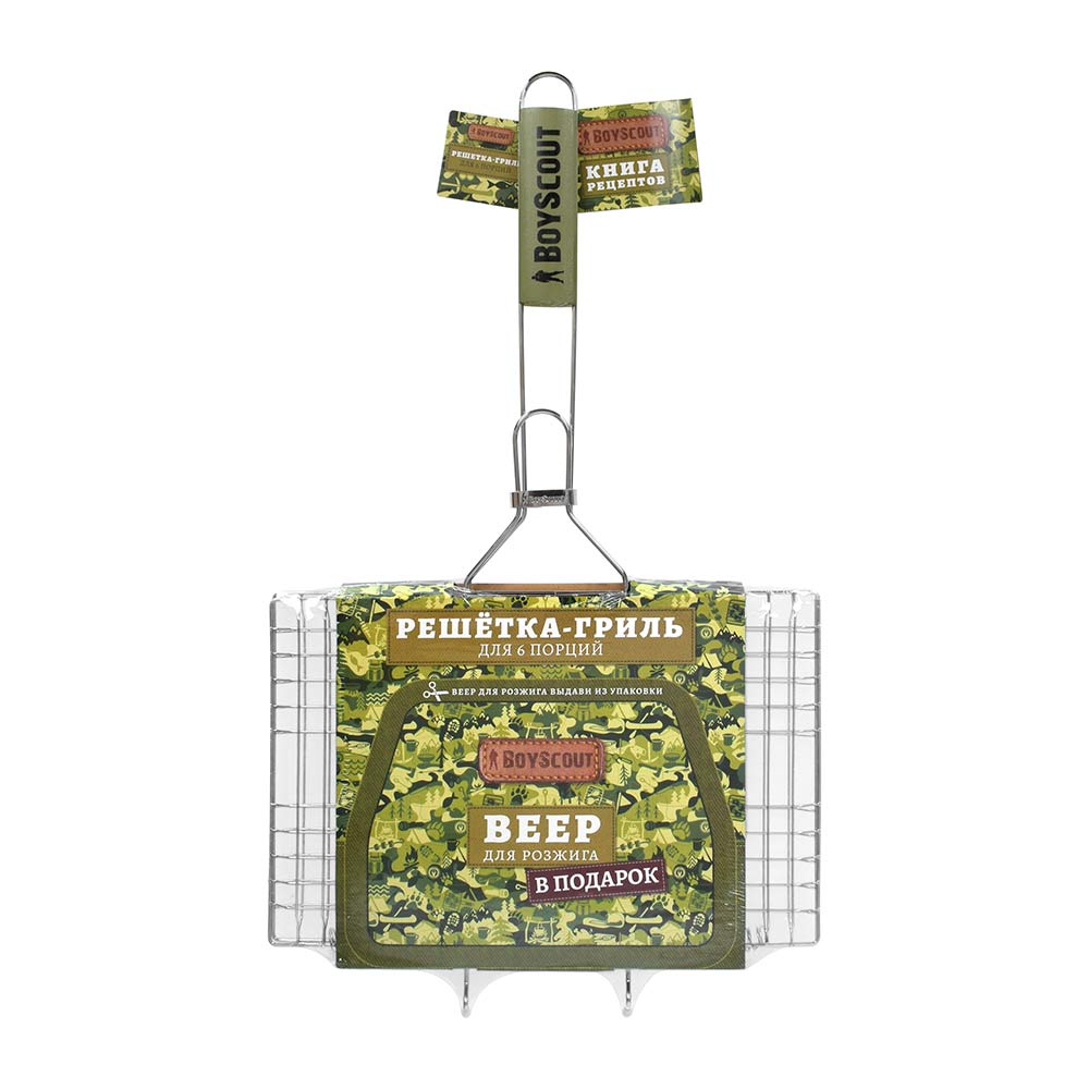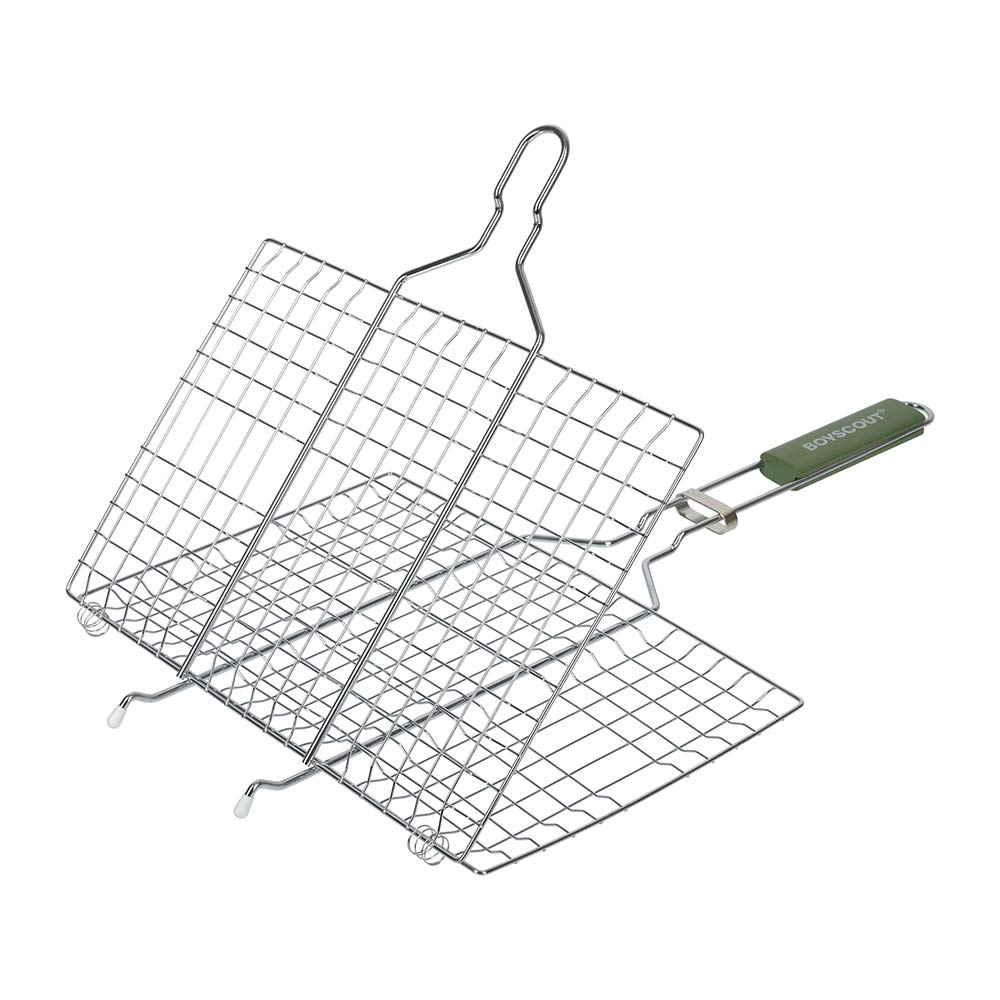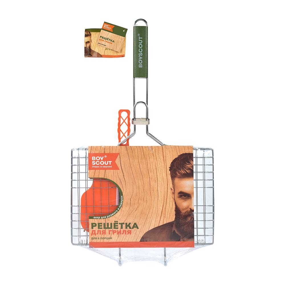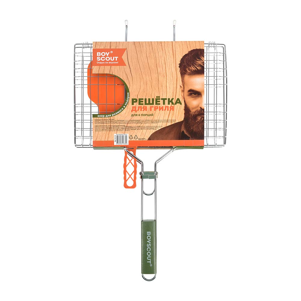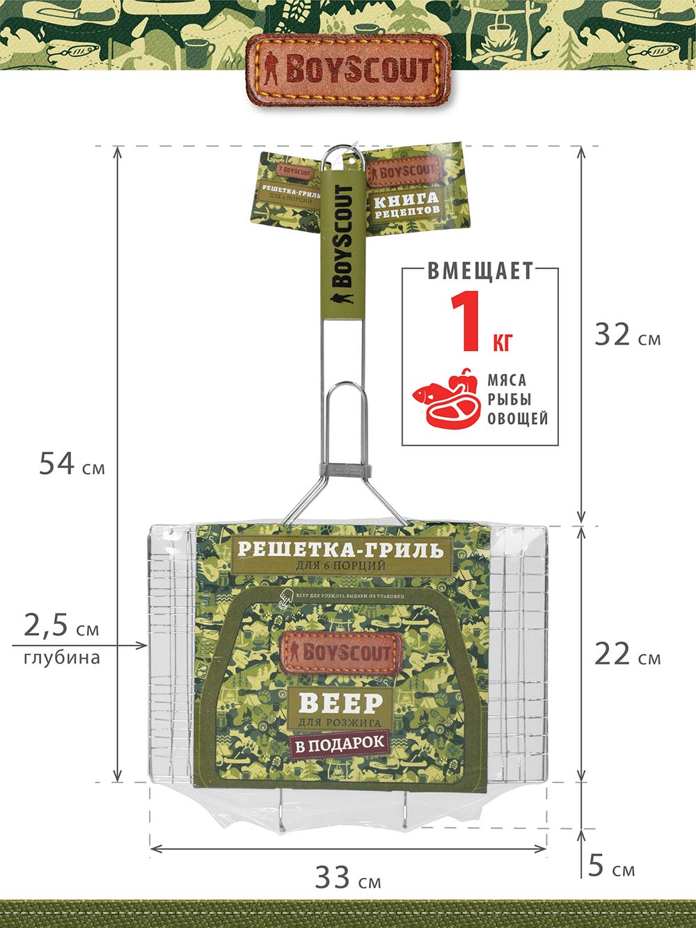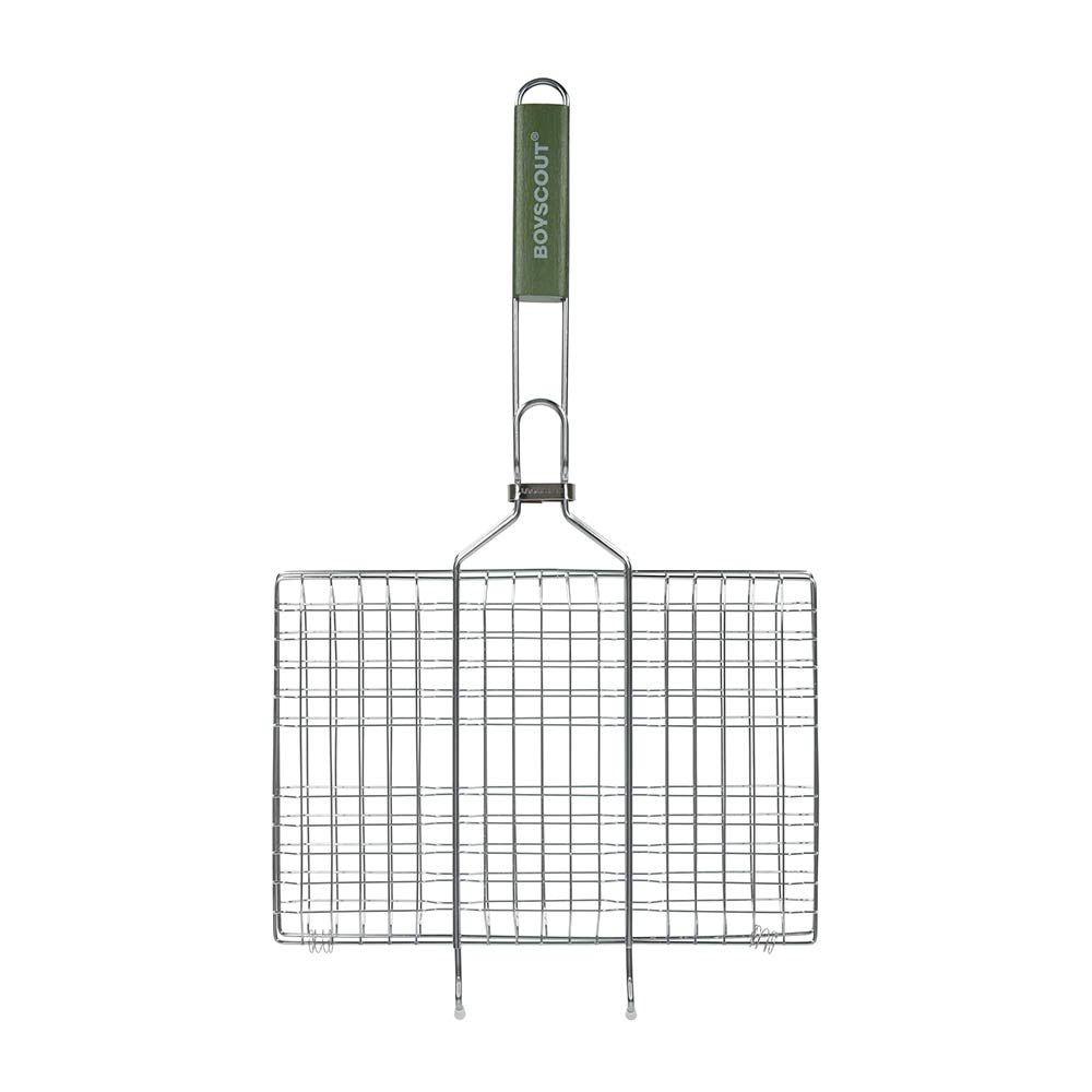 Размер: 54(+5)x33x22x2,5 cм Жарочная поверхность 33*22*2,5 см Решетки для барбекю BoyScout в отличие от шампуров универсальны. Они подходят не только для мяса, рыбы, бифштексов, курицы, но и для сарделек, сосисок, овощей и прочего. Мы предлагаем решетки для барбекю с антипригарным и хромированным покрытием, а также решетки из нержавеющей стали. Решетки имеют деревянные ручки, которые не нагреваются при использовании. Разнообразие размеров и форм позволяет Вам без особых хлопот приготовить вкусную еду в любых количествах.
