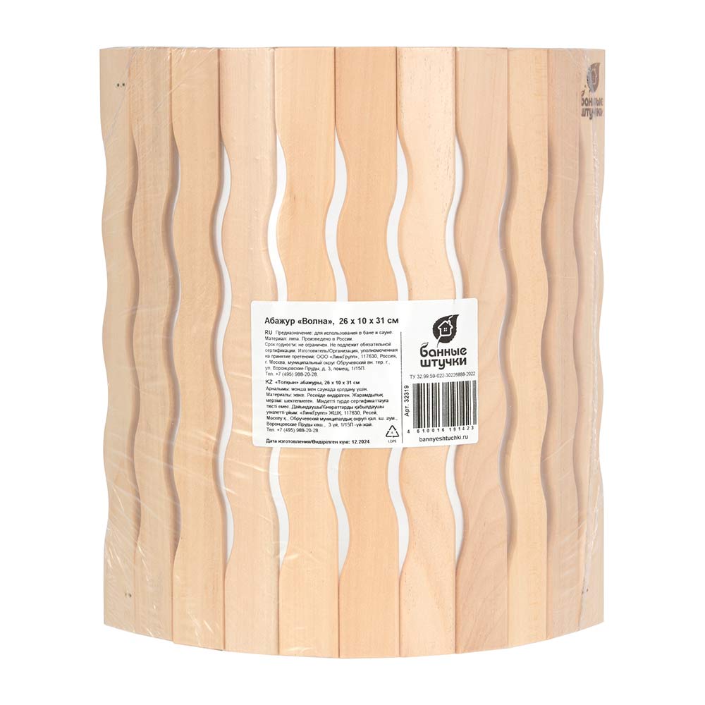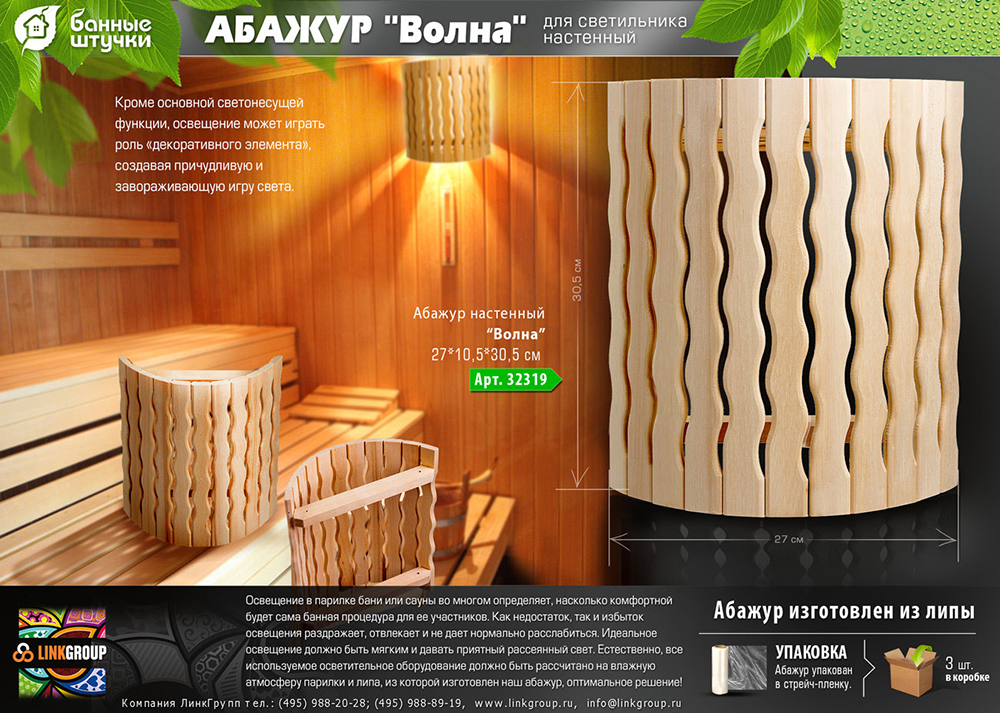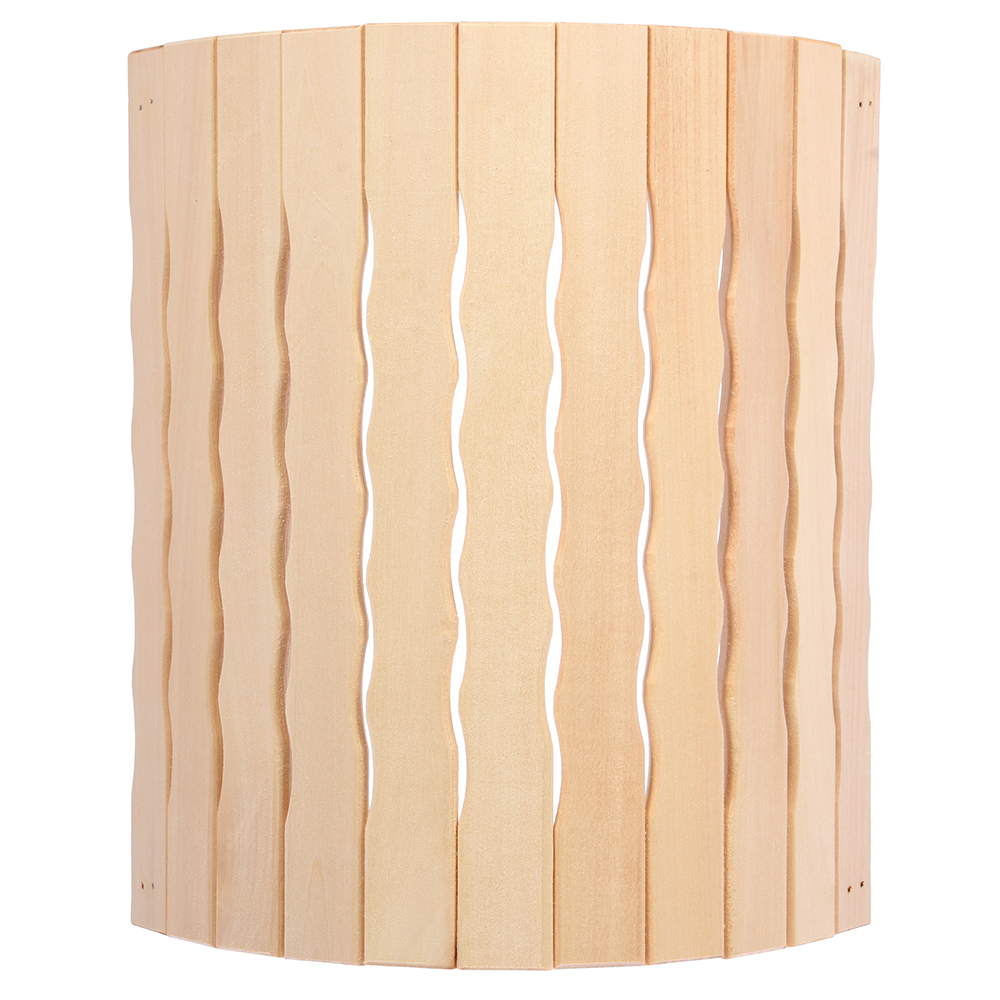 Уют в бане или сауне создается за счет множества важных деталей. Светильник для бани выступает заключительной деталью, без которой обстановка не будет полной. Для придания светильнику большей эстетики и совмещения его с общим интерьером в помещении, используются абажуры из дерева. Свет ламп накаливания, проходя через деревянный абажур, создает впечатление, что перед нами деревянный предмет, светящийся сам по себе. Для бань и саун применяются настенные и угловые светильники и абажуры. Вид индивидуальной упаковки: термоусадка.