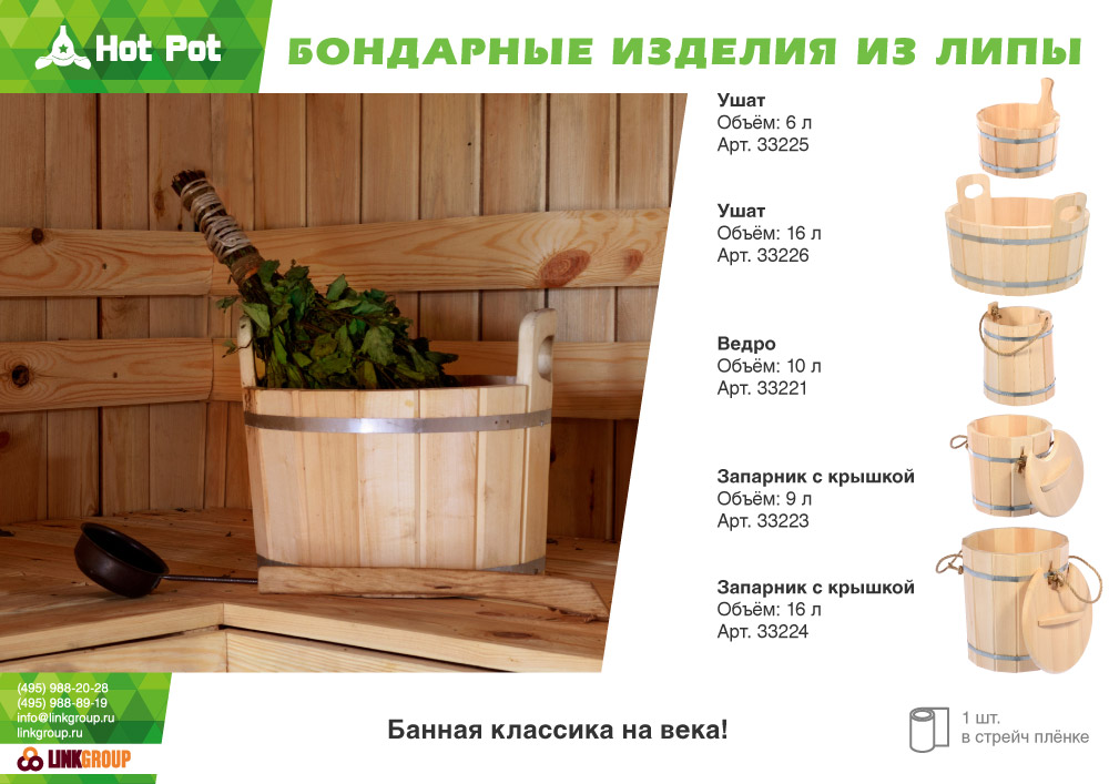 Бондарные изделия, выполненные из липы, прослужат многие годы. Древесина липы является основным материалом при изготовлении бондарных изделий, поскольку она не только обладает уникальными целебными свойствами, но и способна сохранять комфортную температуру в самой жаркой парной.Вид индивидуальной упаковки: отсутствует и пр.