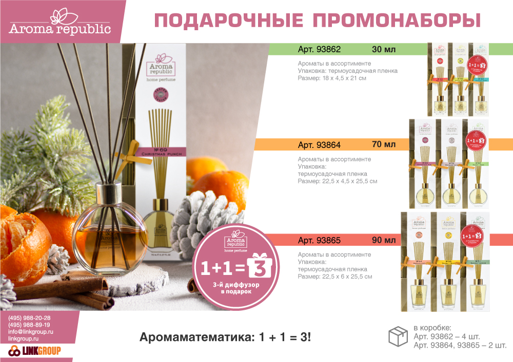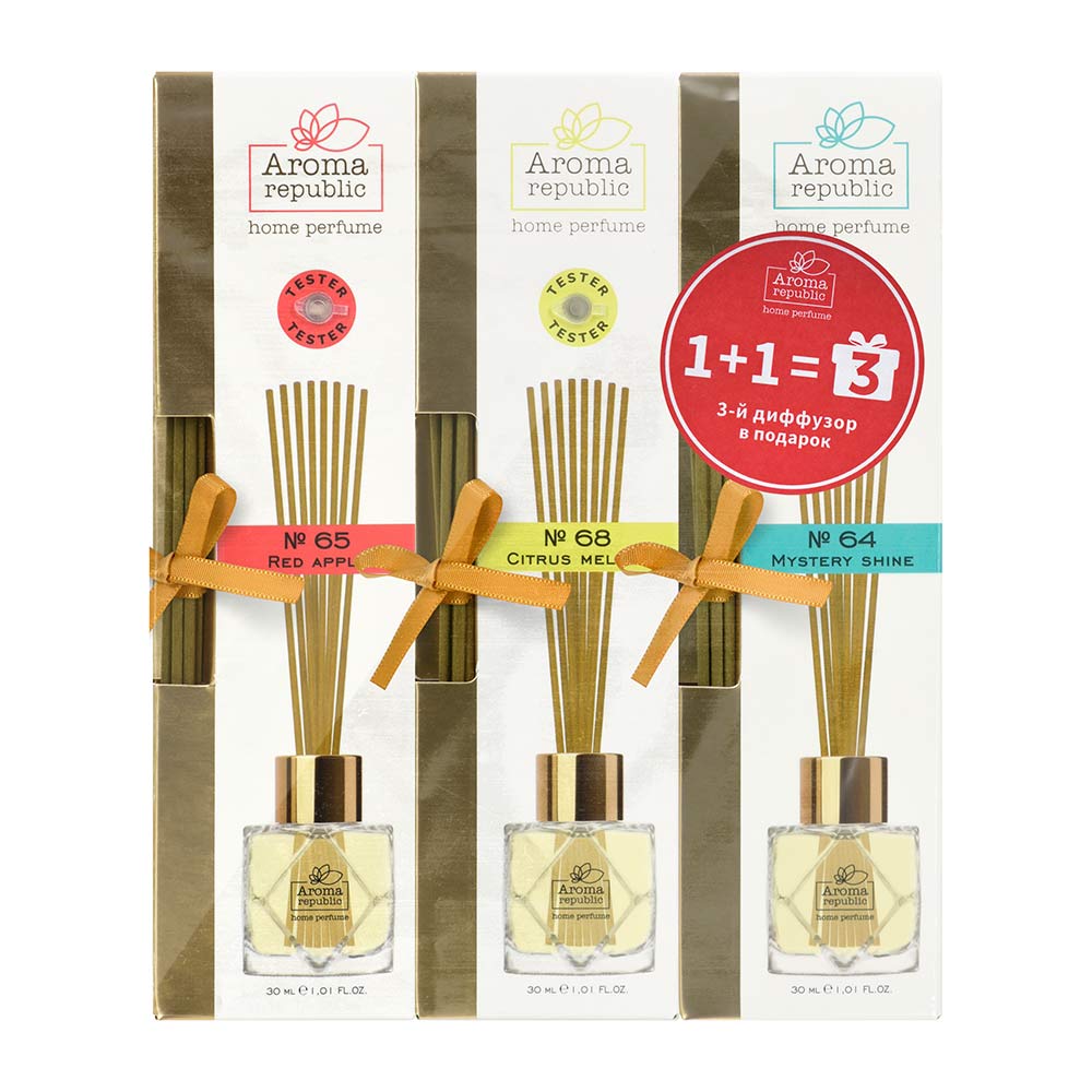Набор ароматизаторов воздуха Aroma Republic - это прекрасный подарок, безопасный и экологически чистый способ наполнить жилое или офисное помещение приятными фоновыми ароматами. Интенсивность запаха можно регулировать количеством палочек - чем их больше, тем насыщеннее аромат. Для лучшей ароматизации рекомендуется чаще переворачивать палочки, желательно раз в сутки.
