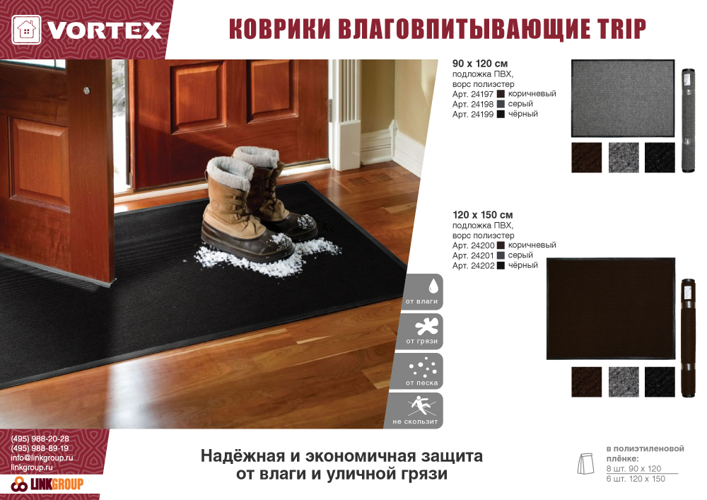 Очищает обувь от грязи и задерживает влагу при входе в помещение, не скользит. Размер: 90 х 120 см.