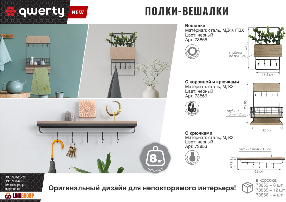 размер 65*13,5*15 см, подвесная полка-вешалка, максимальная нагрузка 2 кг (на крючок 0,35 кг)