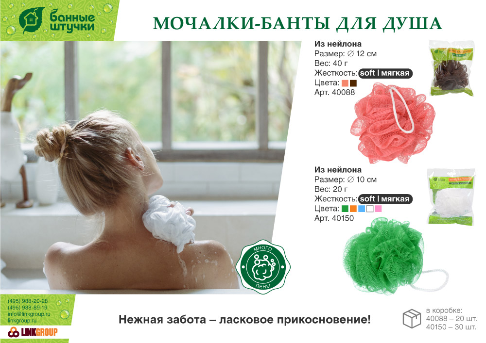 Диаметр:12 см, вес: 40 г. Мочалки из нейлона прекрасно взбивают гель для душа, дают обильную пену, дают массажный эффект. Не вызывают аллергии. Не являются благоприятной средой для размножения бактерий.