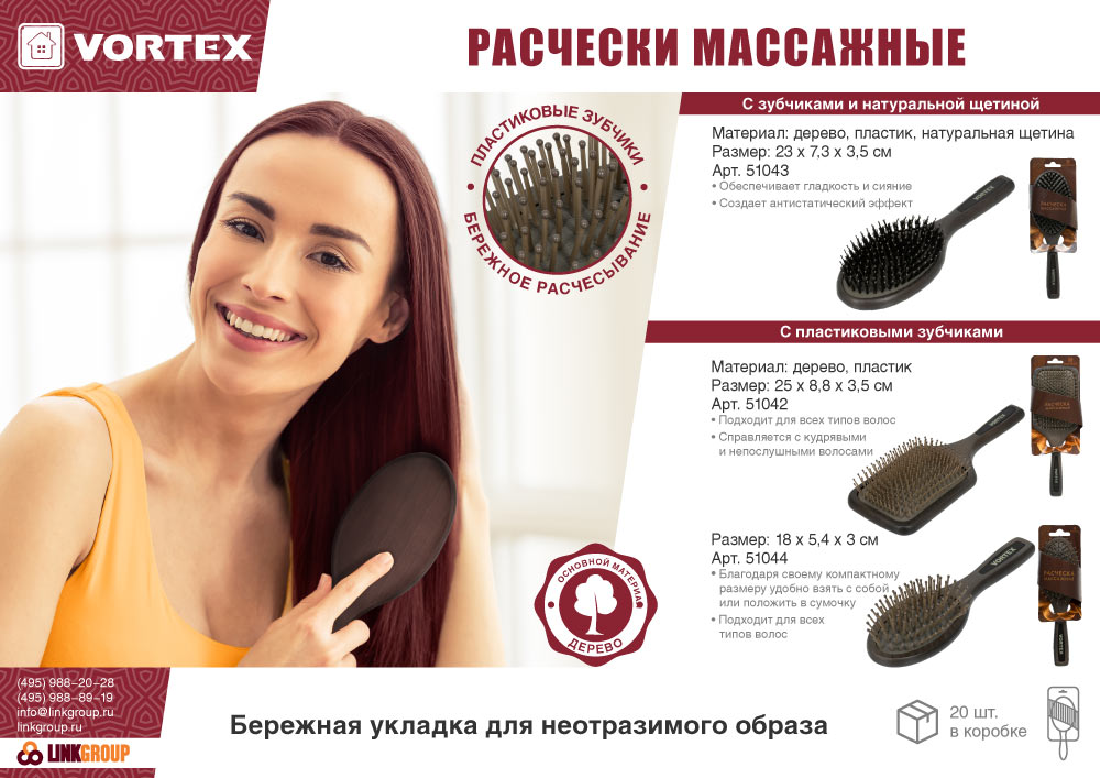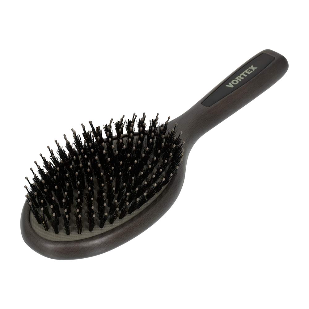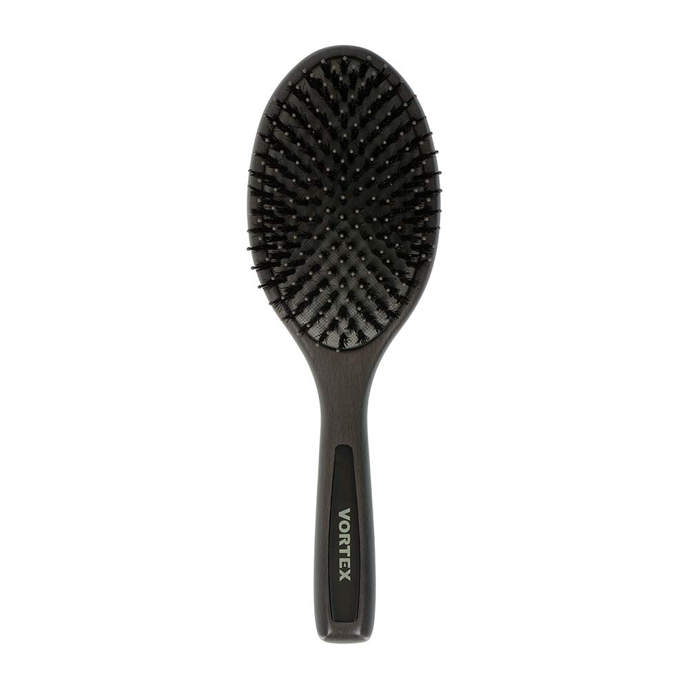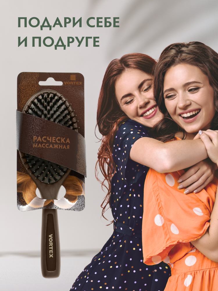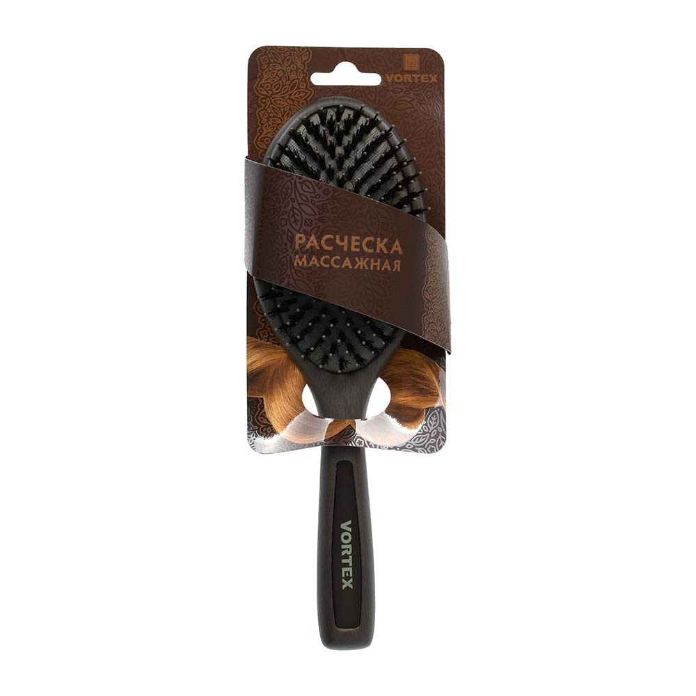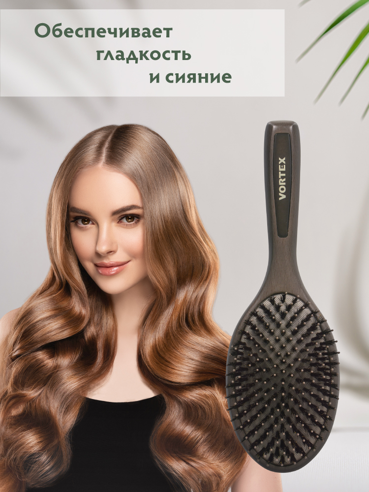 * Натуральная щетина обеспечивает гладкость и сияние, создает антистатический эффект<br>* Подходит для всех типов волос<br>* Подходит для нарощенных волос<br>* Массажирует кожу головы<br>* Справляется с кудрявыми и непослушными волосами<br>Массажная щетка из дерева для волос убирает статическое электричество, бережно расчёсывает и распутывает даже самые тонкие и непослушные волосы. Мягко расчесывает волосы даже при сильном запутывании благодаря двухуровневой щетине: первый уровень щетины из натурального материала расчесывает и разглаживает первый уровень волос, второй уровень нейлоновых зубчиков, более длинный и редкий, аккуратно расчесывает прикорневую зону и приятно массирует кожу головы.