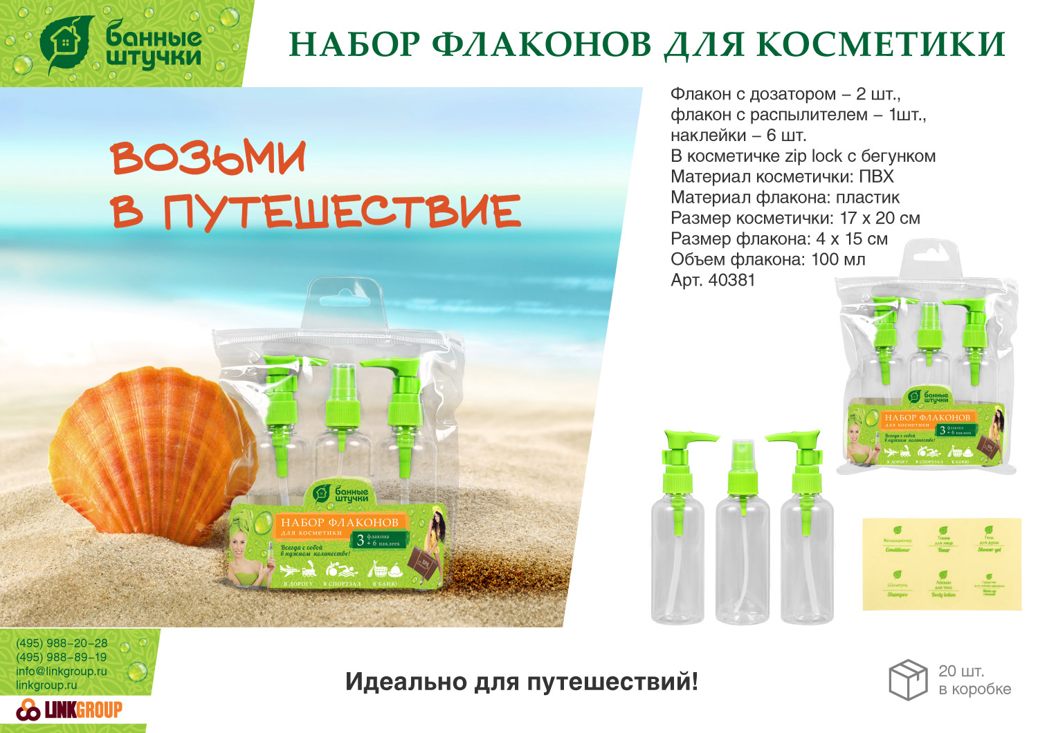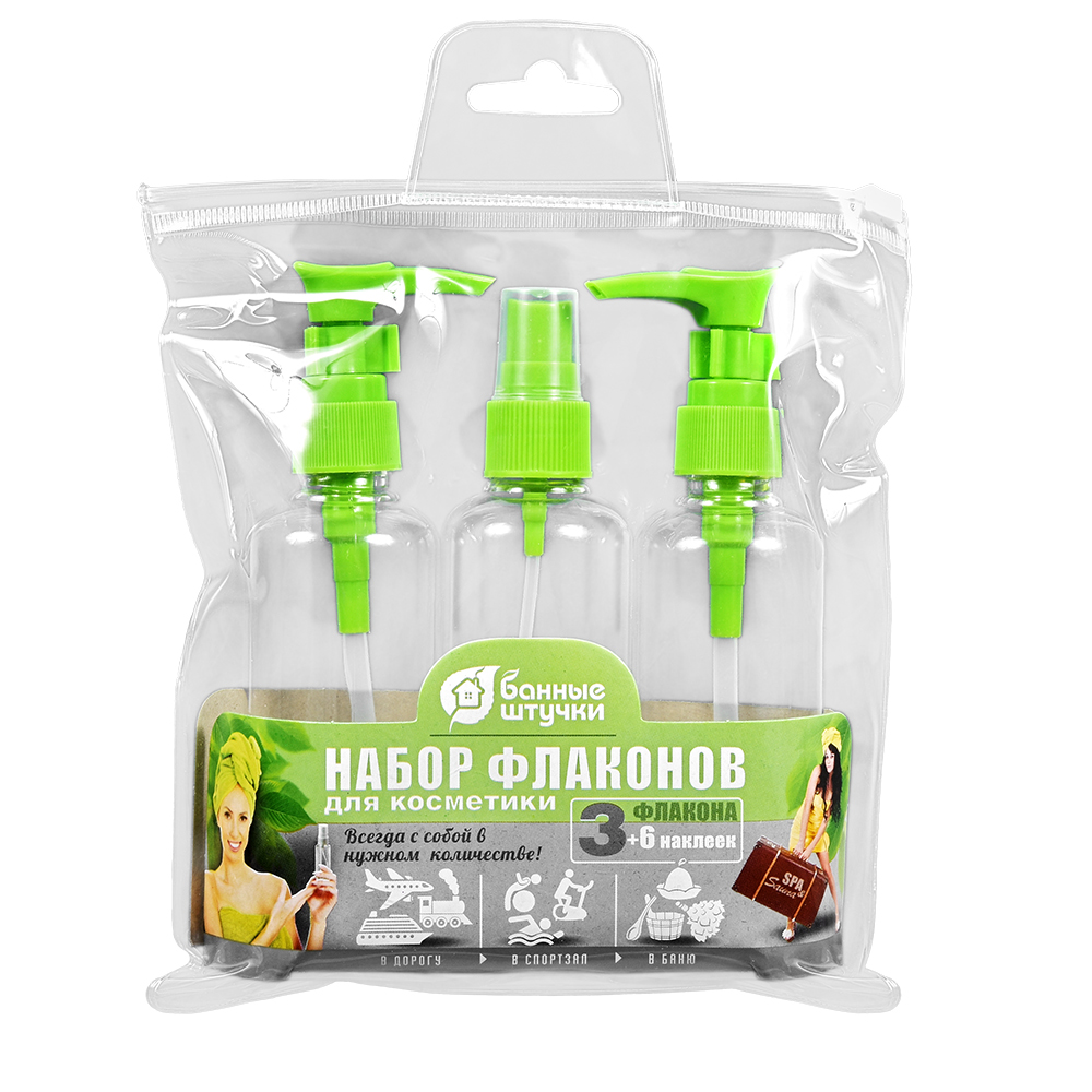 - Материал: Флаконы- PET, спрей- PP, дозатор -PS, косметичка -PVC.