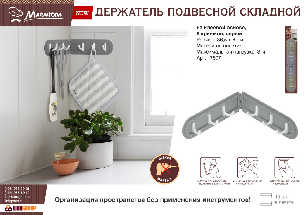 - Способ применения: 1. Перед установкой необходимо обезжирить и хорошо просушить поверхность, на которую будет прикреплён держатель. 2. Снять защитную пленку с клеевого слоя. 3. Плотно прижать изделие к стене.