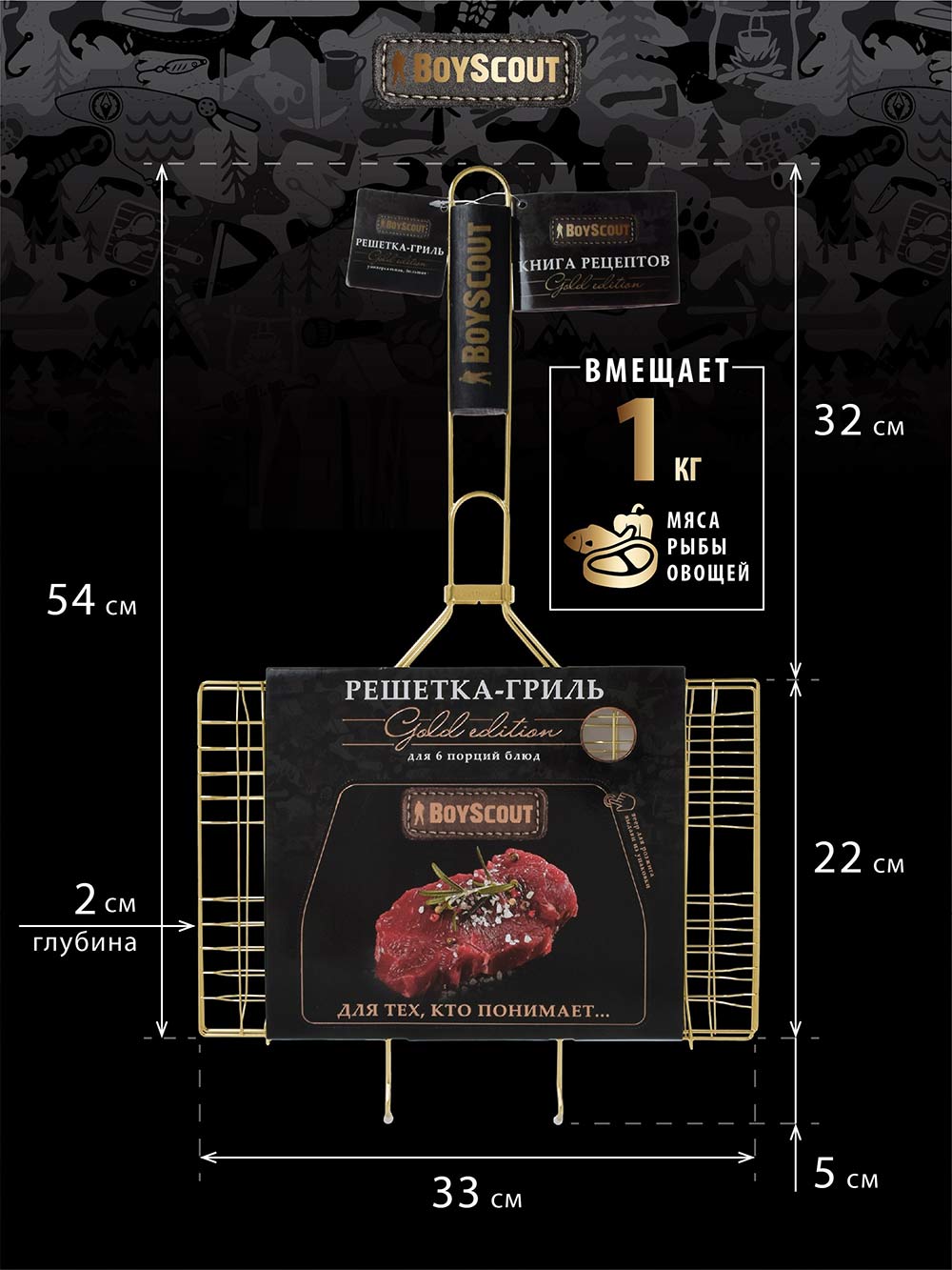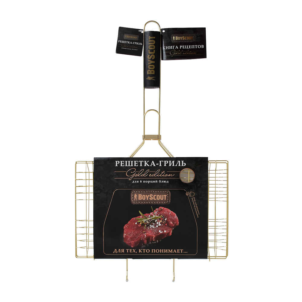Размер: 54(+5) x 33 x 22 x 2 cм. Жарочная поверхность 33*22*2 см Решетки для барбекю BoyScout в отличие от шампуров универсальны. Они подходят не только для мяса, рыбы, бифштексов, курицы, но и для сарделек, сосисок, овощей и прочего. Мы предлагаем решетки для барбекю с антипригарным и хромированным покрытием, а также решетки из нержавеющей стали. Решетки имеют деревянные ручки, которые не нагреваются при использовании. Разнообразие размеров и форм позволяет Вам без особых хлопот приготовить вкусную еду в любых количествах.