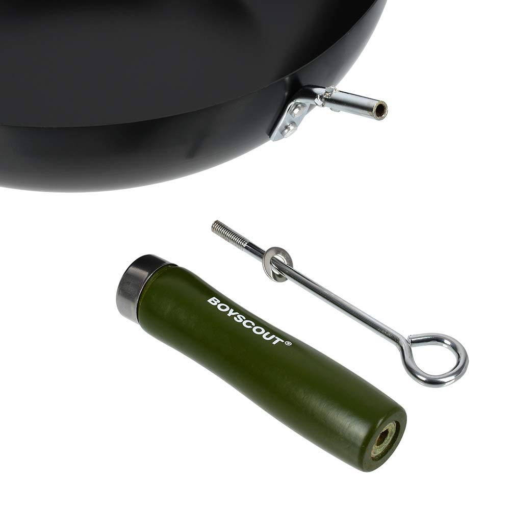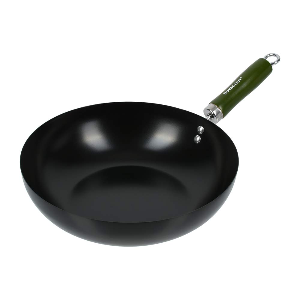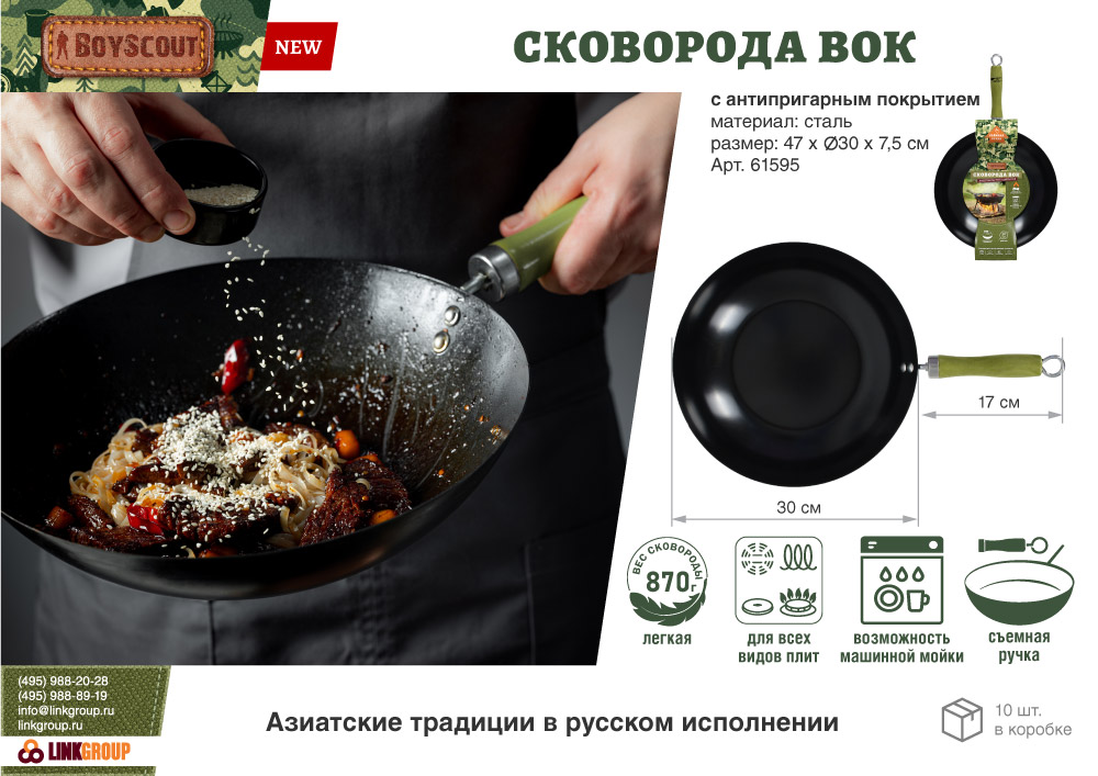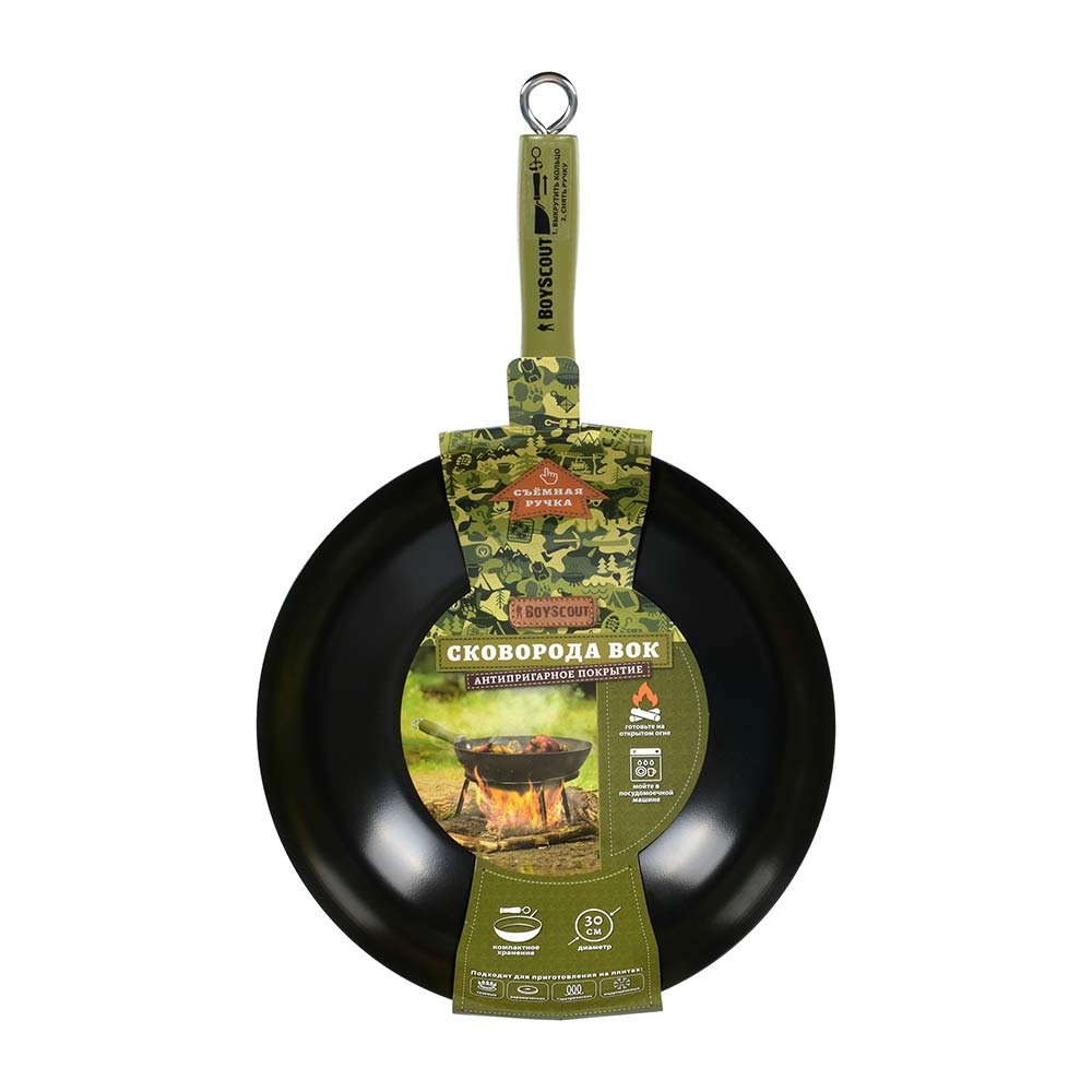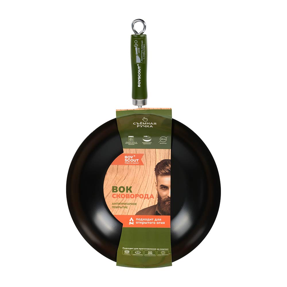 Диаметр: 30 см, длина с ручкой: 47 см. Высота: 7 см. Толщина стали 1 мм. Сковорода ВОК BOYSCOUT - это тонкостенная, глубокая сковорода с удобной деревянной ручкой, которая подходит для всех видов плит и открытого огня.Сковорода ВОК изготовлена из высококачественной стали с антипригарным покрытием, что увеличивает ее износостойкость. Для компактного хранения сковорода оснащена съемной ручкой, а также эта особенность ручки дает возможность мыть вок в посудомоечной машине (перед мытьём ручку нужно снять). При приготовлении блюд отличительной чертой ВОК является отличная теплопроводность - за счёт тонкого дна и стенок сковорода быстро нагревается и охлаждается, что позволяет обеспечить быстрое обжаривание продуктов с сохранением их полезных свойств. Продукты обжариваются настолько быстро, что образуют корочку, которая запечатывает внутри соки и полезные вещества.