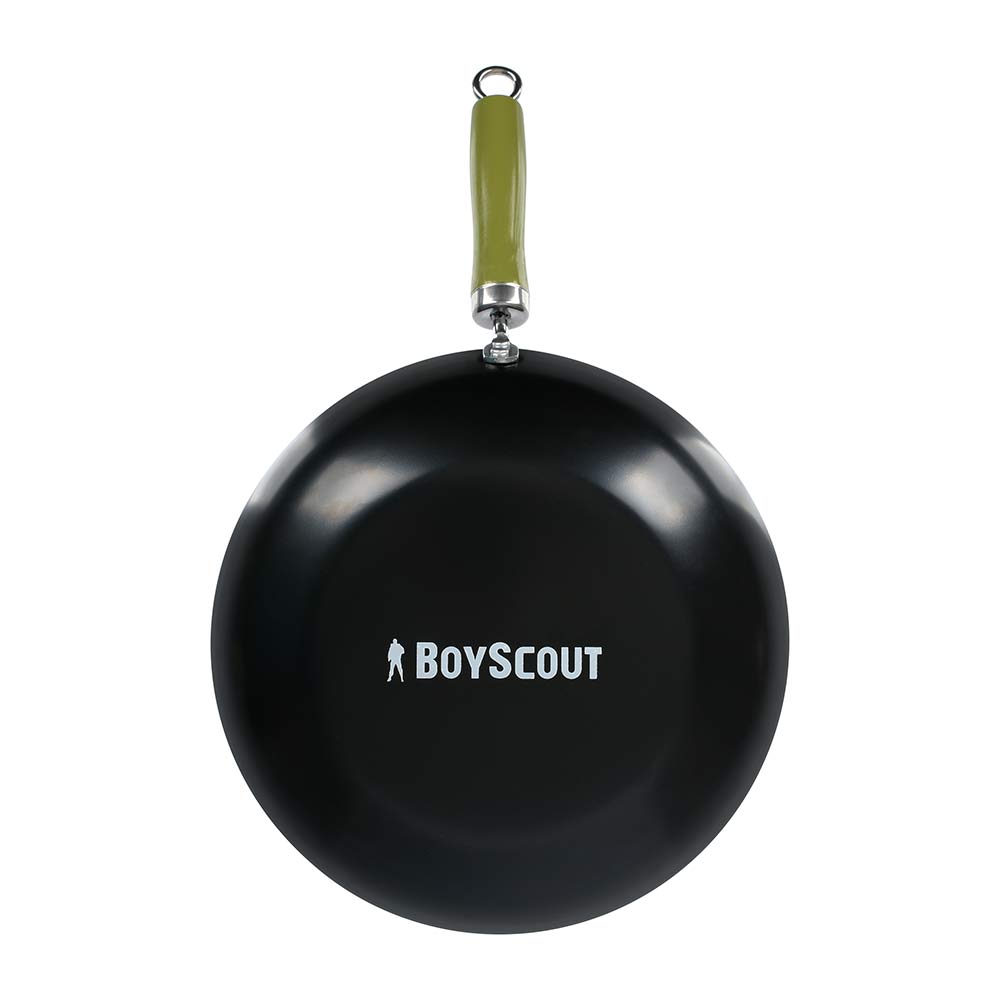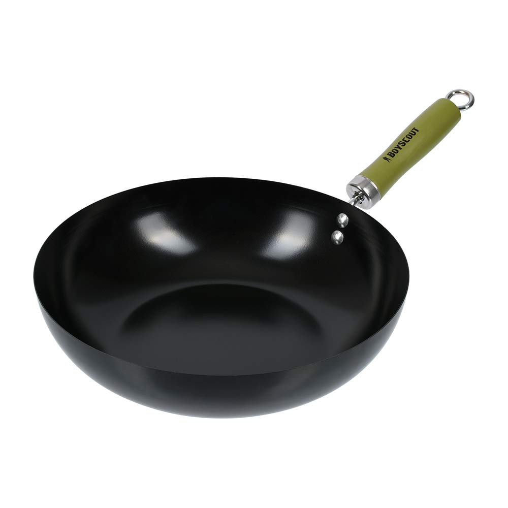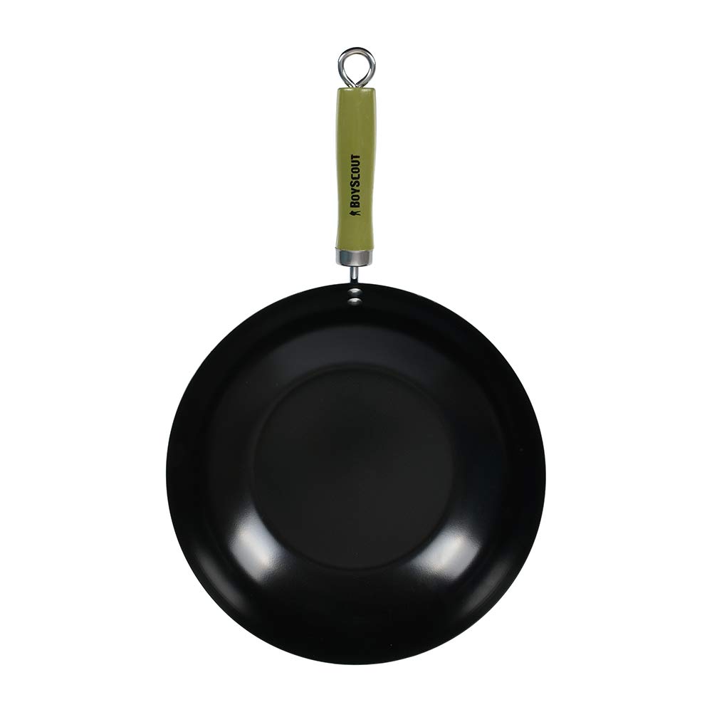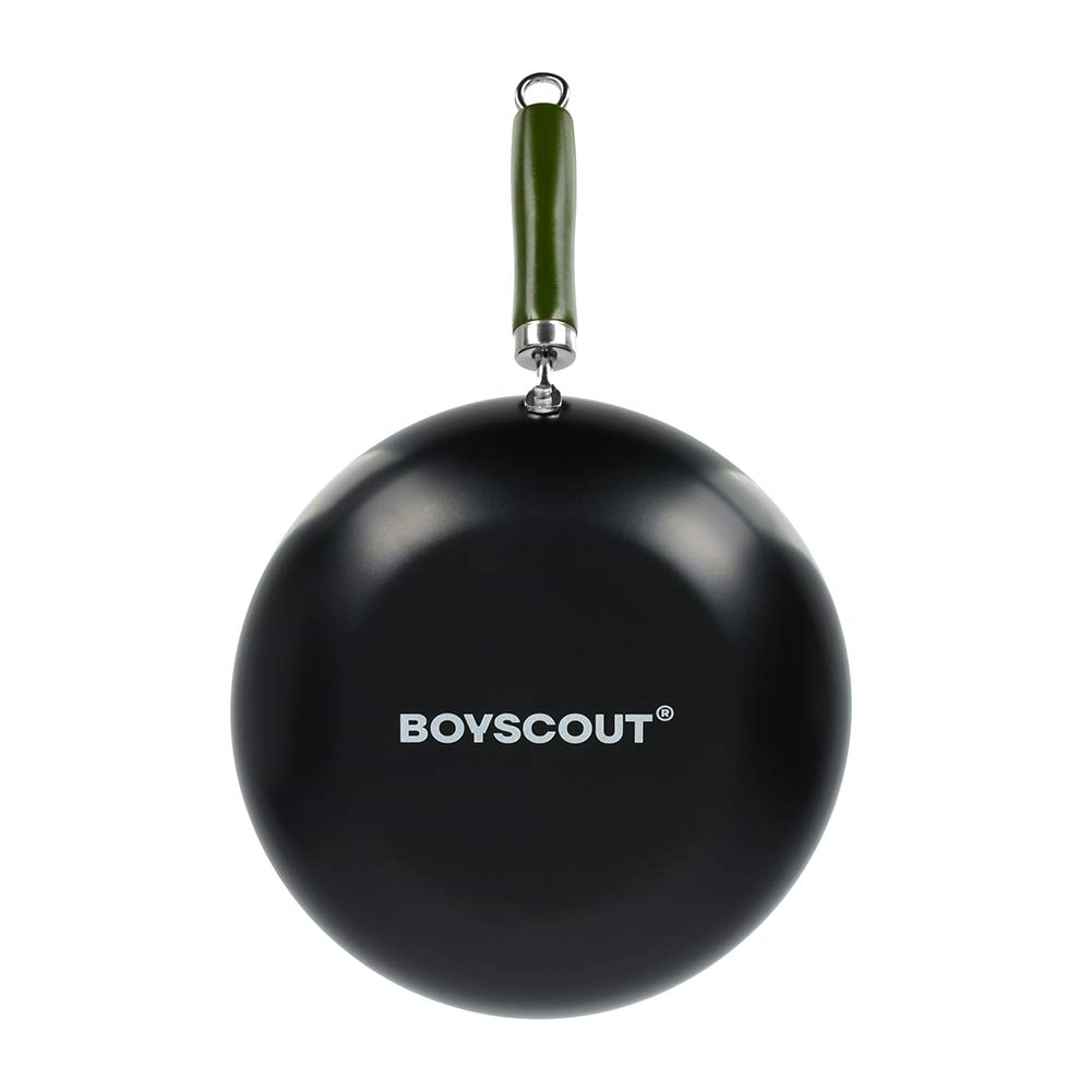Диаметр: 30 см, длина с ручкой: 47 см. Высота: 7 см. Толщина стали 1 мм. Сковорода ВОК BOYSCOUT - это тонкостенная, глубокая сковорода с удобной деревянной ручкой, которая подходит для всех видов плит и открытого огня.Сковорода ВОК изготовлена из высококачественной стали с антипригарным покрытием, что увеличивает ее износостойкость. Для компактного хранения сковорода оснащена съемной ручкой, а также эта особенность ручки дает возможность мыть вок в посудомоечной машине (перед мытьём ручку нужно снять). При приготовлении блюд отличительной чертой ВОК является отличная теплопроводность - за счёт тонкого дна и стенок сковорода быстро нагревается и охлаждается, что позволяет обеспечить быстрое обжаривание продуктов с сохранением их полезных свойств. Продукты обжариваются настолько быстро, что образуют корочку, которая запечатывает внутри соки и полезные вещества.
