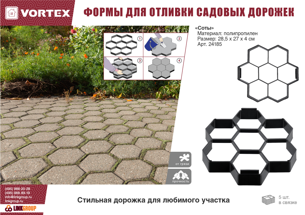 Для того чтобы выложить садовую дорожку без неровностей и изъянов, необходимо подготовить почву. Для этого следует ее прополоть и убедиться что поверхность ровная. Чтобы изделие легче вынималось, перед каждой заливкой форму необходимо смазывать.<br>Изготовление 1. Приготовьте бетонный раствор. Используйте приложенную к цементу инструкцию, чтобы сделать смесь в правильных пропорциях. Если вы используете колорирующие смеси для бетона, необходимо учитывать объем воды для разведения красителя в общем объеме используемой воды; 2. Уложите форму в то место, где планируете сделать дорожку или площадку; 3. Залейте раствором; 4. Разровняйте раствор мастерком; 5. Дайте раствору "схватиться" (в зависимости от выбранной марки от 5 минут до 1 часа); 6. Аккуратно поднимите форму для дорожки; 7. Переложите форму для изготовления садовых дорожек в том направлении, в котором запланирована дорожка; 8. Повторите пункты 2-7.<br>Для эффективной работы рекомендуем использовать не менее 2-х форм одновременно.