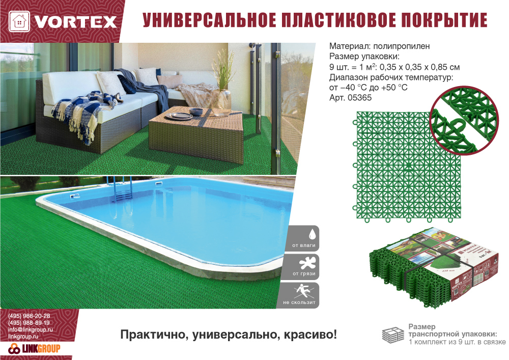 Устанавливается и удаляется без применения инструментов. Укладывается на любую ровную поверхность (допускается ее изношенность и наличие мелких дефектов). Уход за покрытием в помещении: уборка производится с применением пылесоса. Покрытие, установленное вне помещений, легко промыть водой при помощи шланга. При укладке покрытия на грунт см. инструкцию на упаковке. Габаритный размер одной плитки с крепежными "ушами" 34,8х34,8х0,85см, размер одной плитки в собранном виде 33х33х0,85см. Максимльная нагрузка 5тонн на м2.